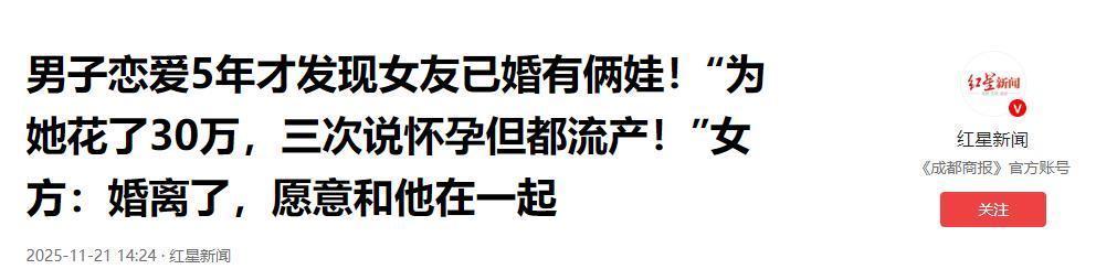 男子恋爱5年才发现女友已婚有俩娃!“为她花了30万,三次说怀孕但都流产!”
